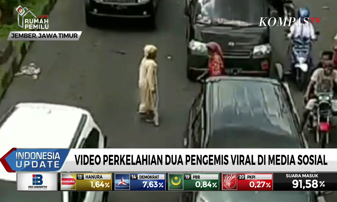 Dua pengemis berkelahi di jalan raya yang dipadati kendaraan bermotor. Video amatirnya viral di media sosial dan kedua pengemis pun digiring ke panti sosial untuk dibina.