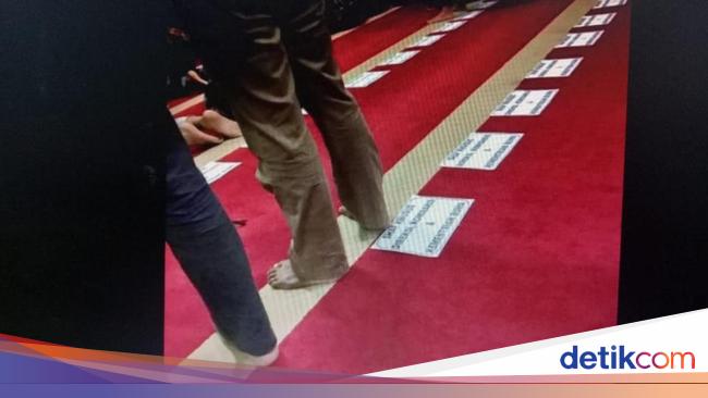 Foto tersebut menampakkan sejumlah sajadah yang dipasangi kertas bertuliskan jabatan-jabatan di Kementerian BUMN. Tertulis 'Shaf Khusus Direksi, Komisaris & Kementerian BUMN'.
