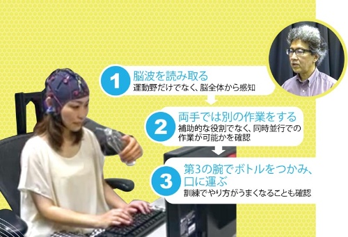 「思うだけで操れる3本目の腕」。西尾氏はBMIを活用したロボットアームをこう表現する。浙江大と同じように脳波をセンサーで読み取り、コンピューター経由でロボットアームに伝える仕組みは既に開発済み。特徴的なのはBMIを、障害のある人の補助システムとしてだけでなく、より多くの人が様々な作業を同時に進める際の「人工腕」にするところまで考えている点だ。システムの操作には訓練が必要だが、「多くの人が上手に操れるようになることも証明している」と西尾氏は話す。
