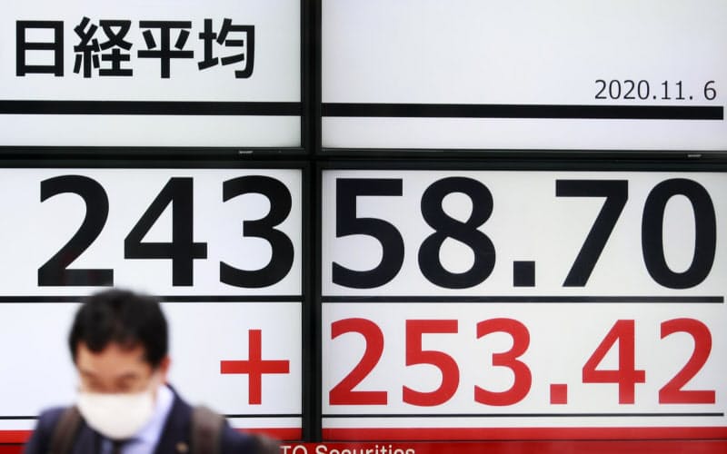 6日の東京株式市場で日経平均株価は2018年10月2日終値の2万4270円62銭を一時上回り、1991年11月13日以来約29年ぶりの高値水準まで上昇した。米議会上院で共和党が多数派を維持する見込みとなり、IT(情報技術)企業への規制など民主党主導の大幅な政策転換に対する警戒感が和らいだ。