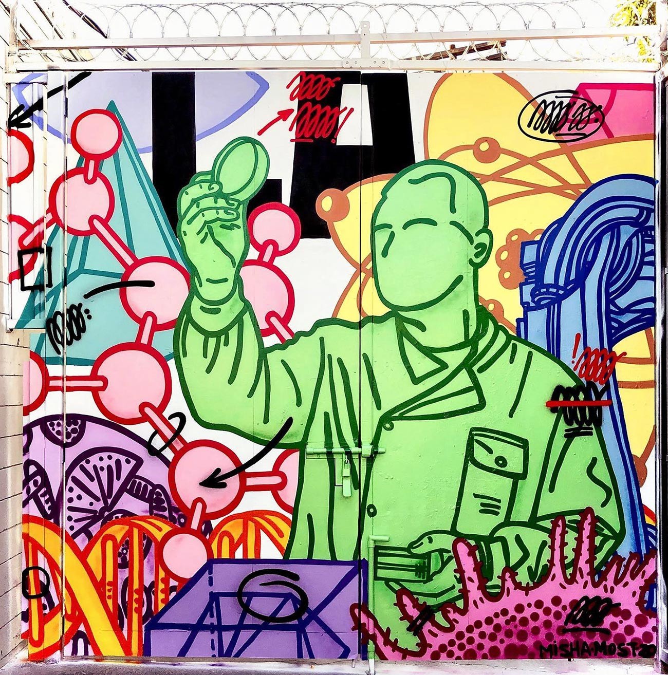 ミーシャ・モストはストリート・アーティストとして活動をスタートさせたが、2000年にロンドンのギャラリー向けの作品作りに方向転換した。かつてバンクシーを世界に紹介したロンドンの画商ラザリデスとも共同活動している。モストはアメリカでよく知られており、数年前に、シリーズ「過去の未来」で、大規模な作品を作っている。2020年、コロナ禍のロサンゼルスを訪れ、「イン・サーチ・オブ(〜を探して)」というタイトルの壁画を描いた。ミーシャの画像作品はファウンデーションで、4.95ETH(現在のレートで18,000ドル)で販売された。購入者には、特典として水彩バージョンの作品が贈られた。