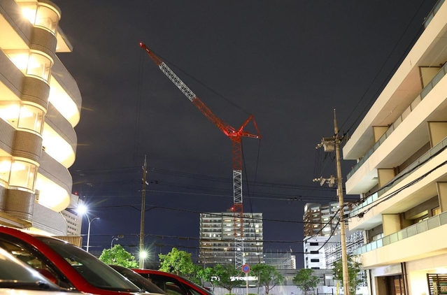 神戸市西区役所の新庁舎建設工事を巡り、「夜間もクレーンが伸びたままで、倒れてきそうで怖い」という声が神戸新聞の双方向報道「スクープラボ」に寄せられた。工事が行われていない夜に現場を訪ねると、確かにクレーンの長い首が伸びている。もし横倒しになれば、道路を挟んで建つマンションにも当たりそうに見える。