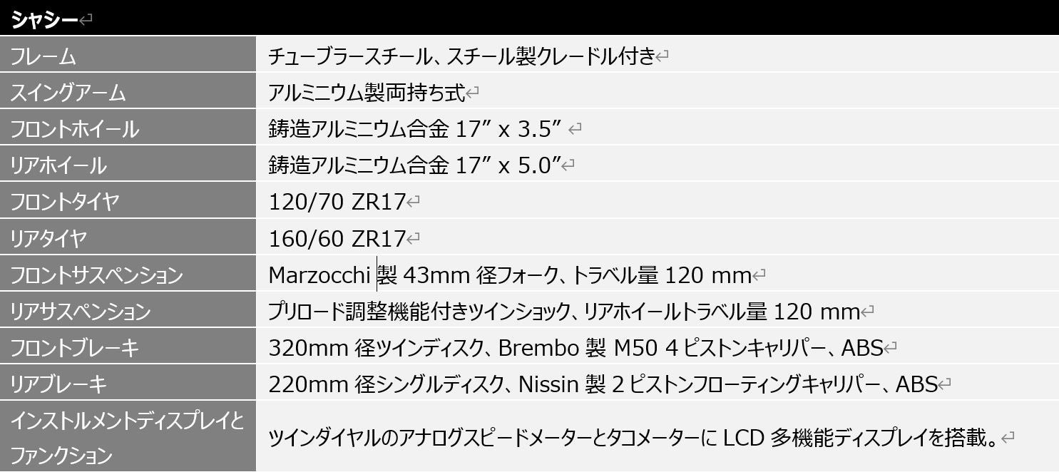 現代的な3Dクロックは、ハンドルバーに取り付けられたスクロールボタンでアクセスするデジタルメニューシステムを搭載しています。ギアポジション、2つのトリップ設定、燃料レベル、残燃料ゼロまでの距離、平均・現在の燃料消費量、トラクションコントロール設定、TPMS表示(アクセサリーとして装着した場合)など、ライダーが必要とするすべての主要情報が提供できます。
