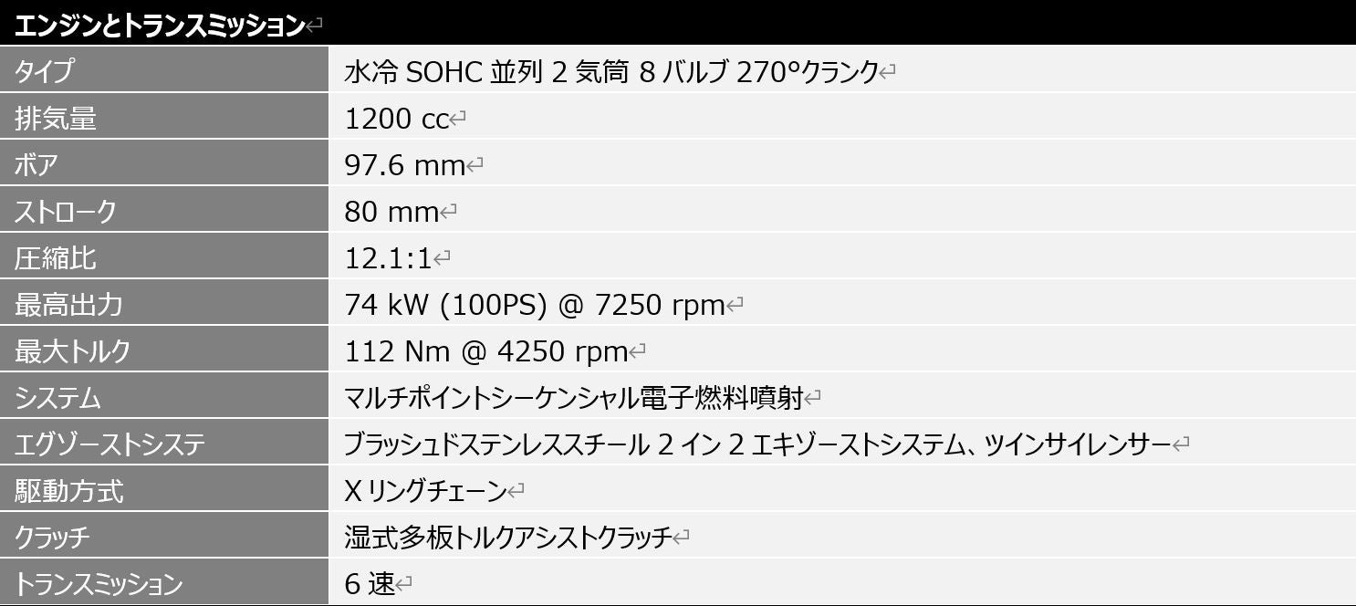 Speed Twinのエンジンのレスポンスは、新型の軽量クランクシャフトとオルタネーターによってイナーシャ(慣性)が17%低減されたことで、前世代よりも向上しています。これにより、エンジンは前世代よりも速く回転し、より長く激しく回転し、レッドラインは前世代よりも500rpm高くなりました。さらに、高圧縮ピストン、ポート、カム形状を変更することで、パフォーマンスが向上しました。