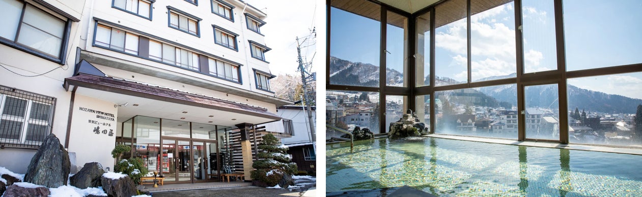 温泉街の高台に位置する野沢 ビュー ホテル 嶋田屋には、眺望のすばらしい大浴場と広々とした客室があり、くつろぎのひと時を過ごせます。