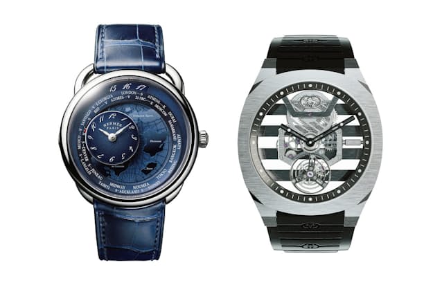 文字盤の地図は、エルメスのスカーフの有名な絵柄“乗馬の世界地図”がモチーフ。そこに置かれた時計ディスクは、ボタンをクリックするたびに円軌道を描きながら移動し、外周の世界24都市のローカルタイムを表示する。ちなみにホームタイムの時表示は12時位置の窓。非常に操作しやすく、エルメスならではのエスプリも感じさせる傑作ワールドタイムだ。自動巻き。右/径41㎜。プラチナ+チタンケース。予価344万3000円、左/径38㎜。SSケース。予価269万5000円。11月発売予定。(エルメス)