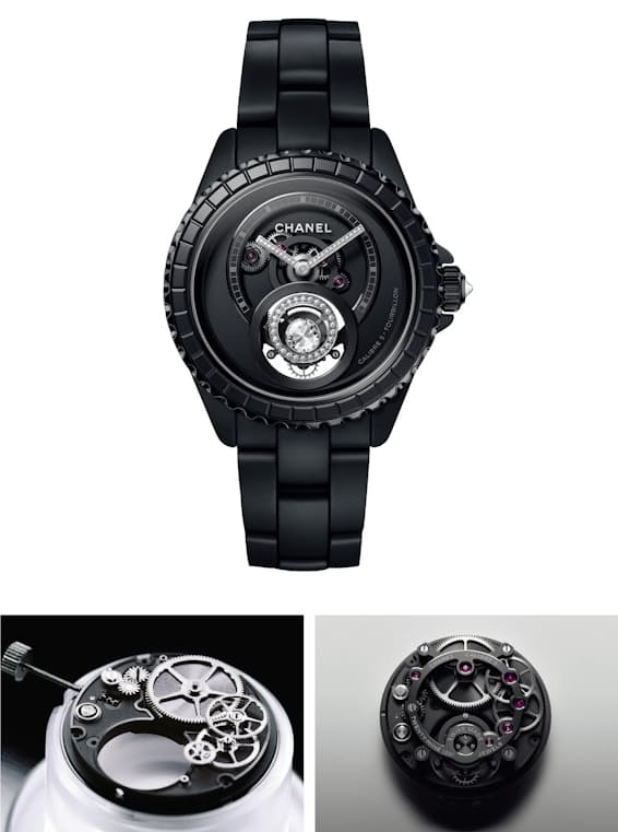 メゾン初の自社製トゥールビヨンを搭載。針やリューズ、そしてキャリッジ中央にはきらめきながら回転するダイヤモンドをあしらい、漆黒のJ12をミステリアスに演出している。自動巻き。径38㎜。高耐性セラミック+SSケース&ブレスレット。世界限定55本。1243万円。発売中。〔シャネル(カスタマーケア)〕