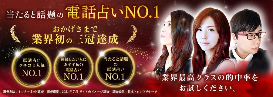 電話占いカリスは採用率5%以下の全国から当たると口コミで評判の電話占い師が所属している占いサービスです。2021年7月には、日本トレンドリサーチが行うインターネット調査にて電話占い業界初三冠(電話占い口コミ人気/復縁したい人におすすめの電話占い/当たると話題の電話占い)達成しました。