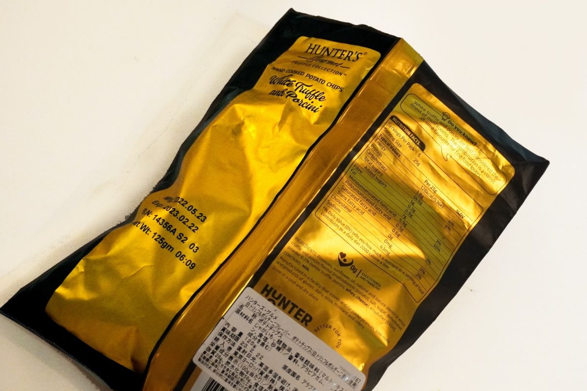 マットな黒地にシルバーの文字でデザインされたパッケージは、見るからに高級そうです。 こちらはアラブ首長国連房・ドバイの「ハンターフーズ」社が展開するポテトチップス。そのなかでも最もハイクラスな「グルメシリーズ」のプラチナセレクションです。同シリーズの黒トリュフフレーバー ポテトチップスは、エミレーツ航空のファーストクラスでも提供されているとのことですから、期待感が高まります。