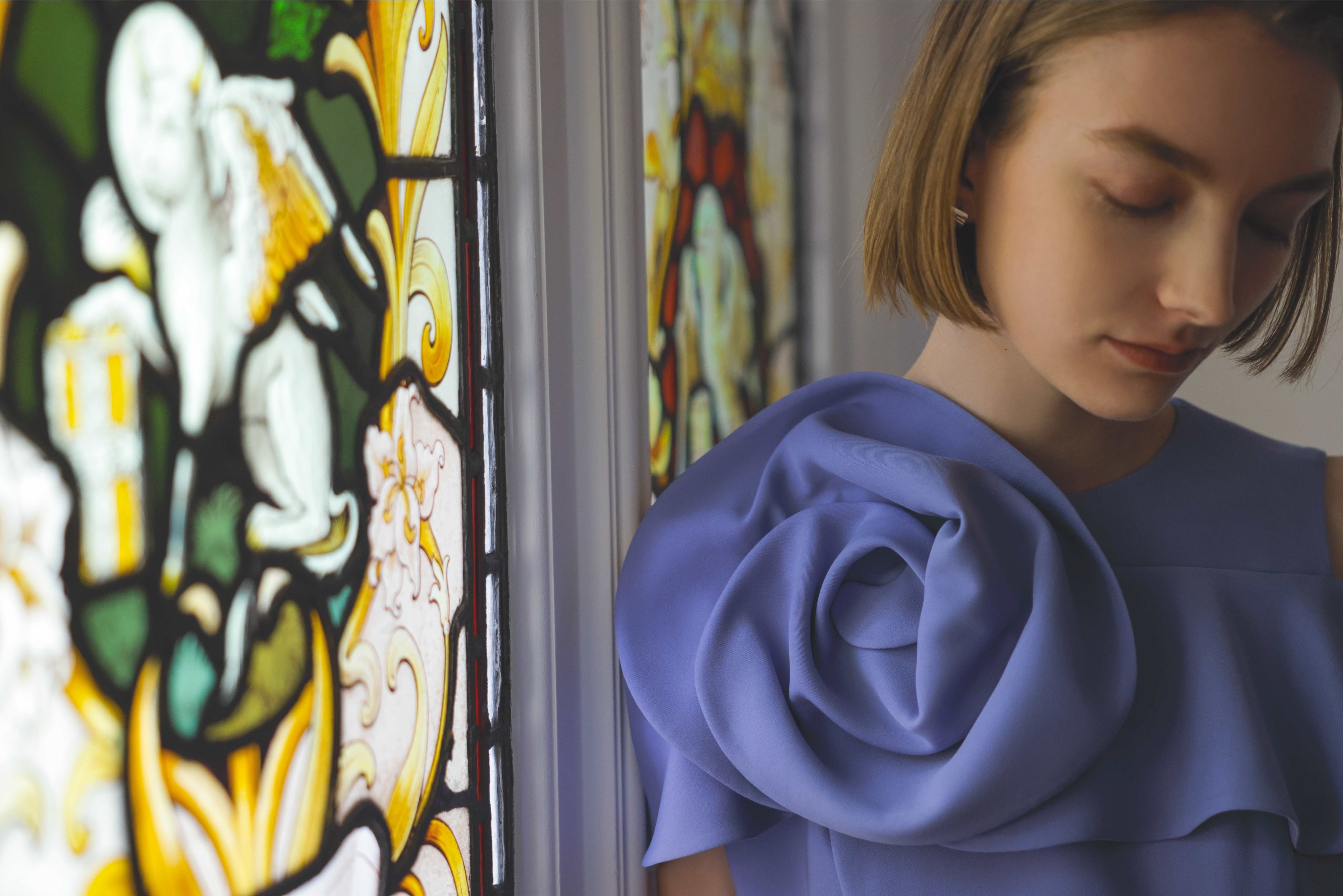 風に舞い上がるような大胆なオーガンジーの重なりが肩周りを美しくカバーしてくれる、クチュール技法が詰まったドレス。